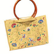 Tiny mirrors in the centre of the large flowers add a hint of sparkle to this gorgeous artisan bag. Topped with wood hoop handles for that hit of extra flair.